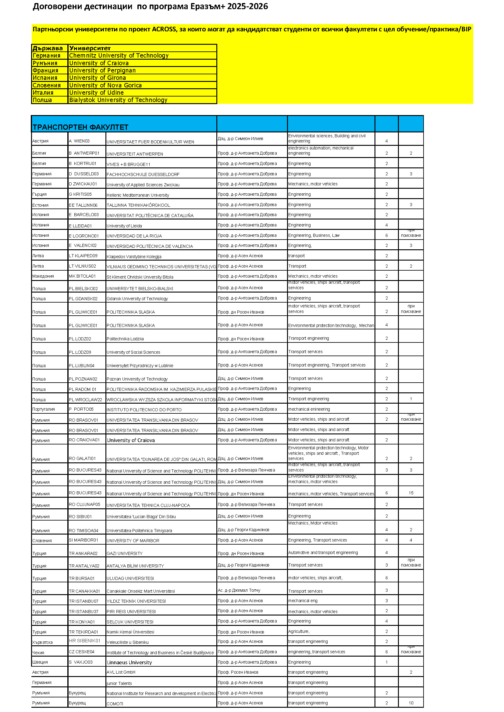 Преподаватели от Транспортния факултет активно работят със Еразъм чуждестранни студенти. За въпроси може да се обърнете към Еразъм координаторите, посочени в приложения списък: