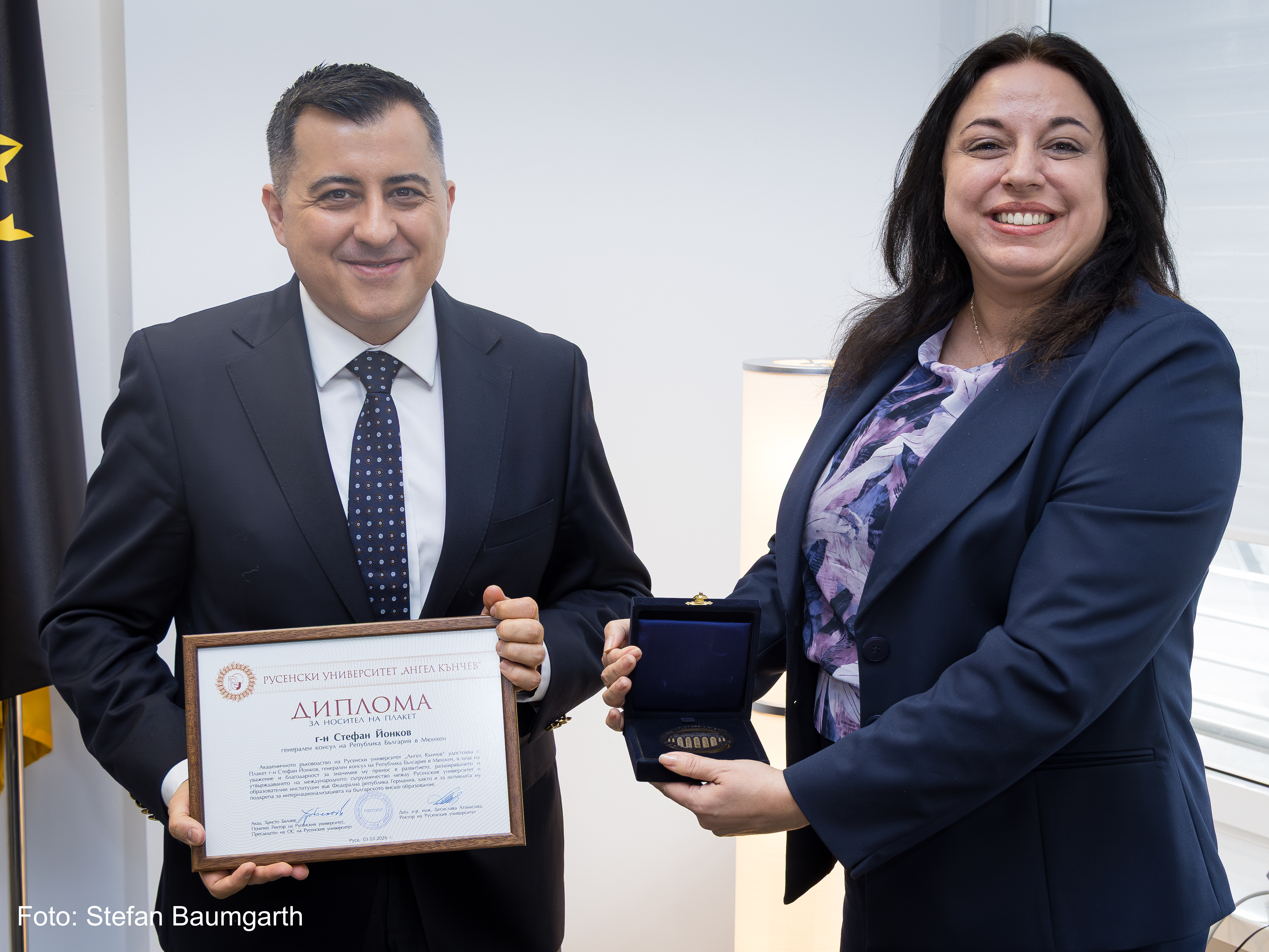 Today, March 17th , 2026, he held a meeting with the Rector of the University of Ruse, associate Professor Desislava Atanasova, PhD, which was also attended by professor Plamen Zahariev, PhD, Head of the Department of Telecommunications. They discussed the establishment of long-term cooperation between the University of Ruse and the university in the capital of the Republic of North Macedonia, as well as the signing of a bilateral agreement for the exchange of students and faculty under the Erasmus+ programme. Opportunities for conducting joint research and working on joint educational and scientific projects were also commented.