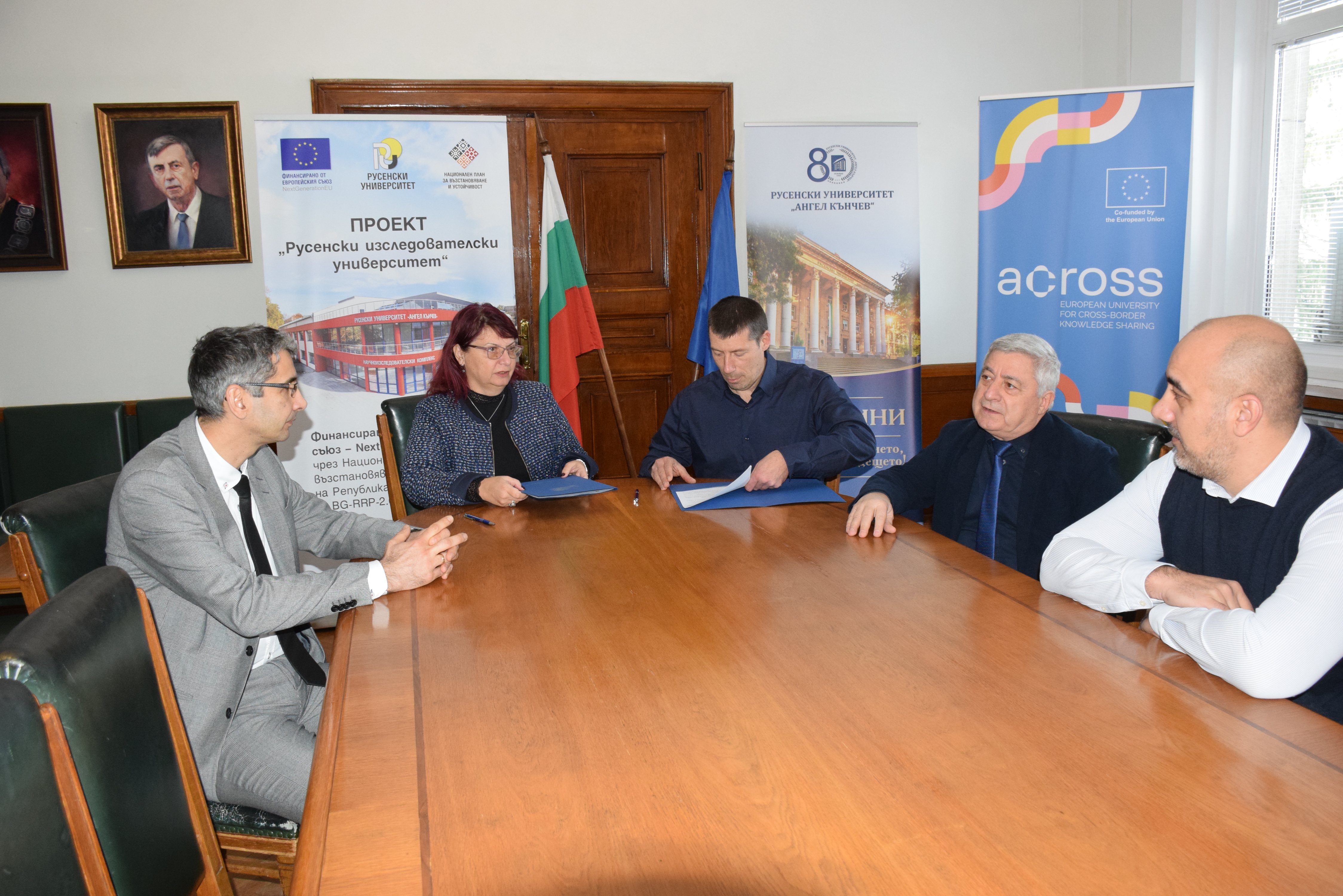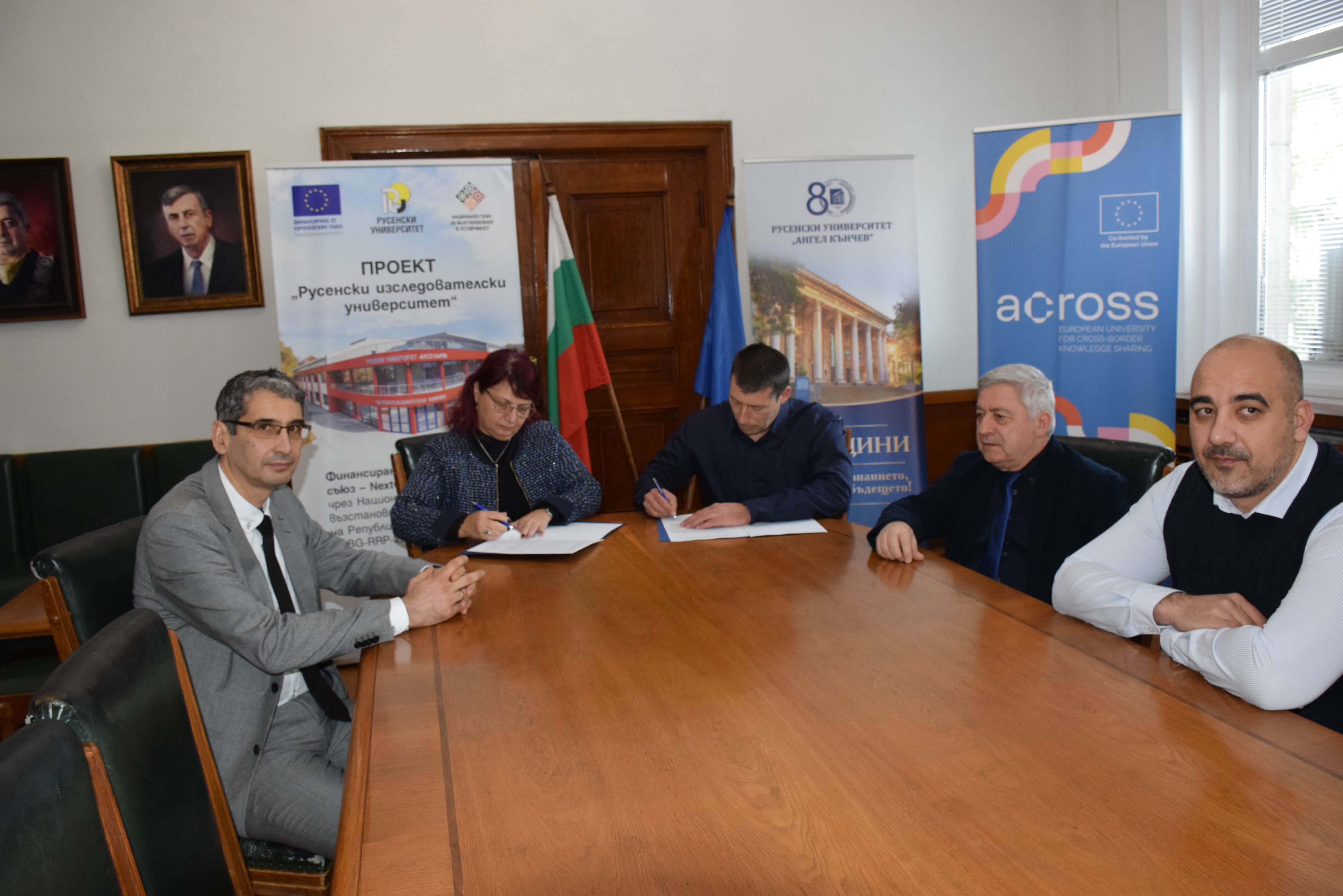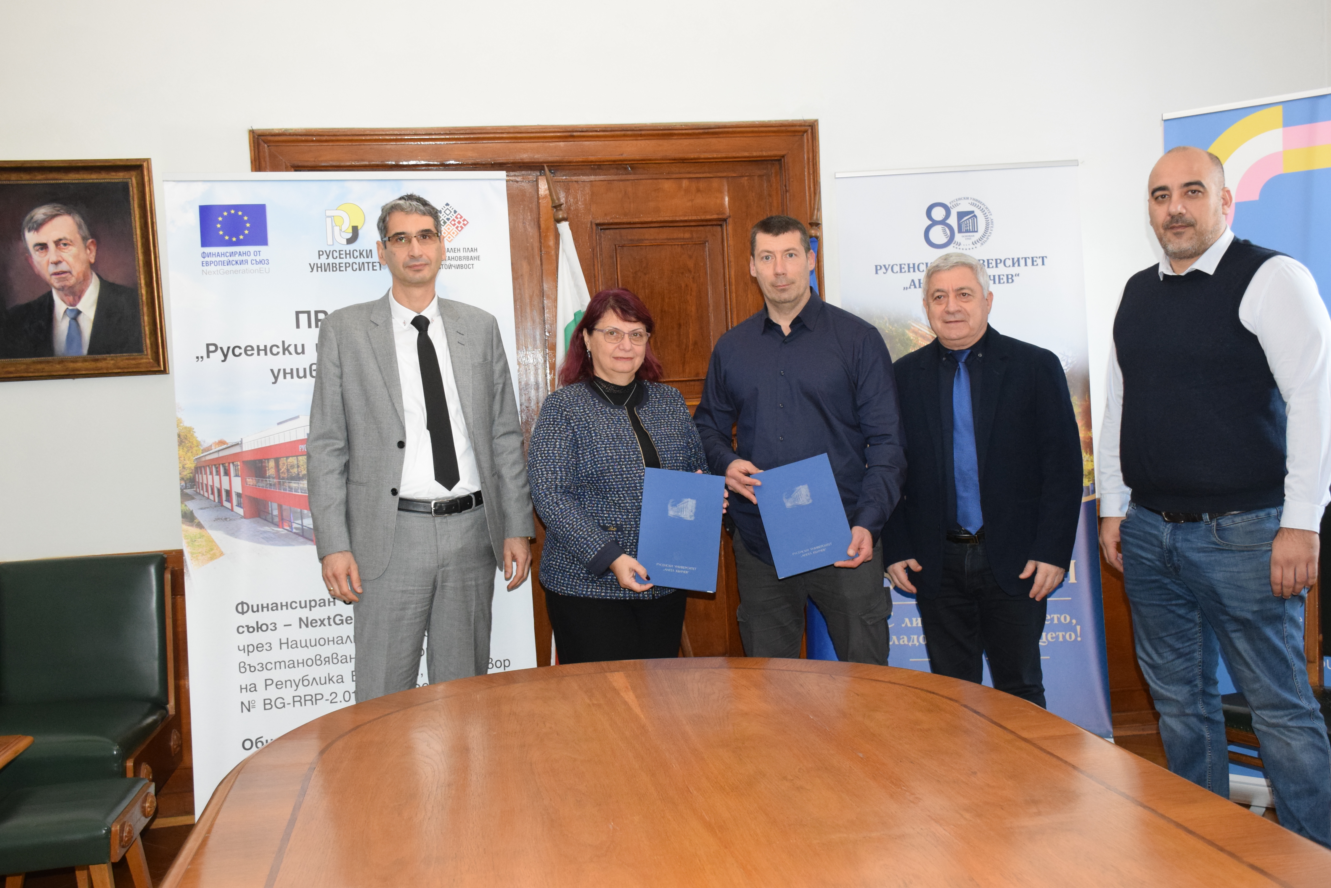 The signing was attended by Academician Hristo Beloev, DscEng, honourary rector and chairman of the General Assembly of the University of Ruse, Vice-Rector Professor Teodor Iliev, and Senior Assistant Professor Yuri Tsenkov.